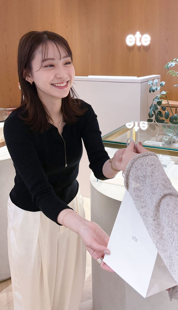 また、eteのジュエリーをより多くの方に身に着けてもらえるよう、お客様に寄り添い、安心感のあるスタイリストであり続けたいです。